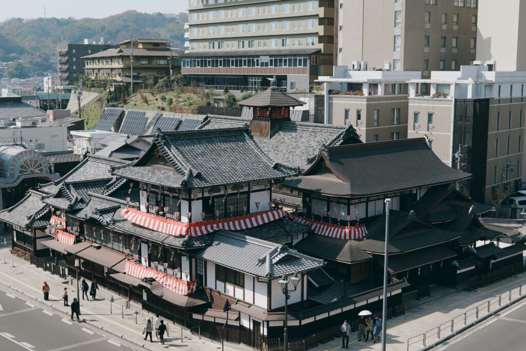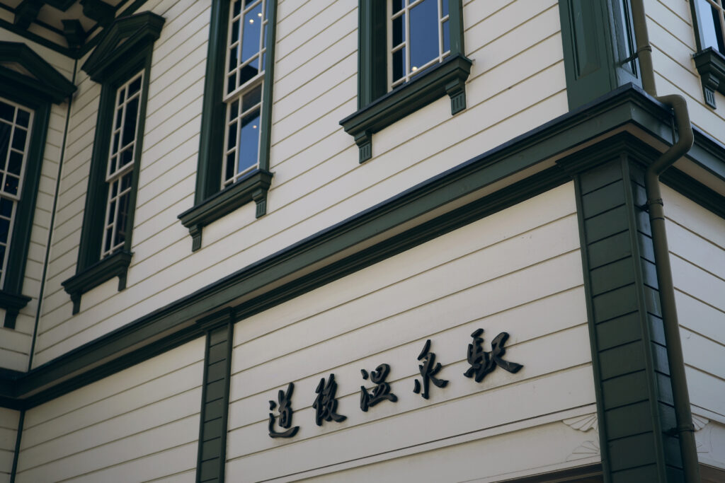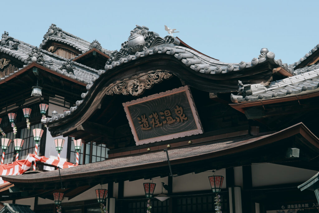 道後温泉の中心にある木造三層楼の建物は、明治時代に建てられた風情あふれる佇まい。