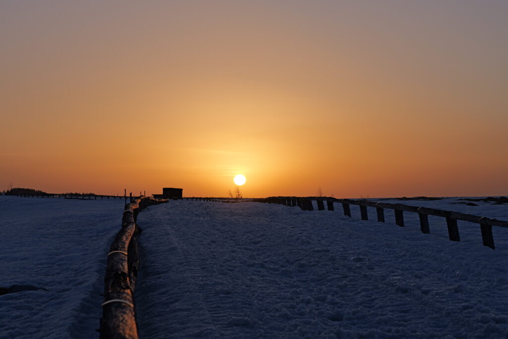 一面の雪が静かに広がる景色の中、空がゆっくりとオレンジ色に染まり始めます。